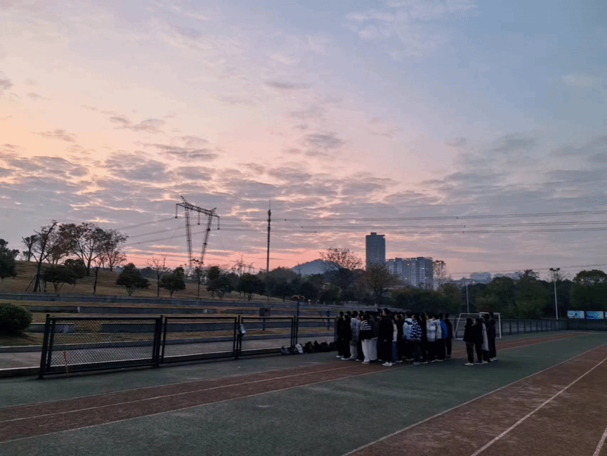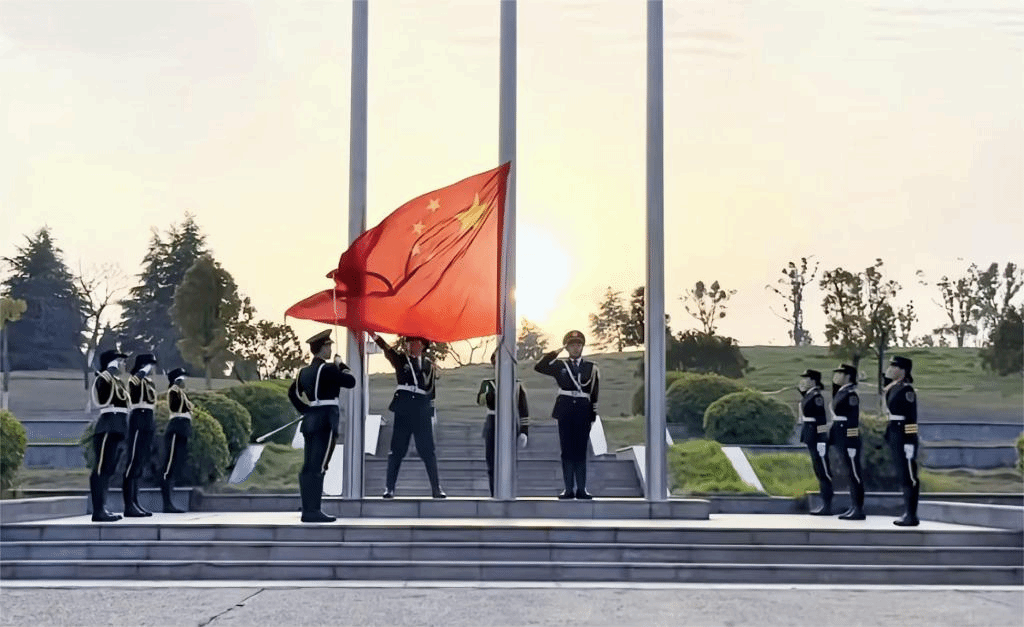 太阳初出光赫赫,国旗护卫队英姿飒爽、昂首阔步,伴随着庄严的国歌,五星红旗冉冉升起,迎风飘扬,全体师生肃立,向国旗行注目礼,齐唱国歌,表达对祖国的热爱与崇敬。