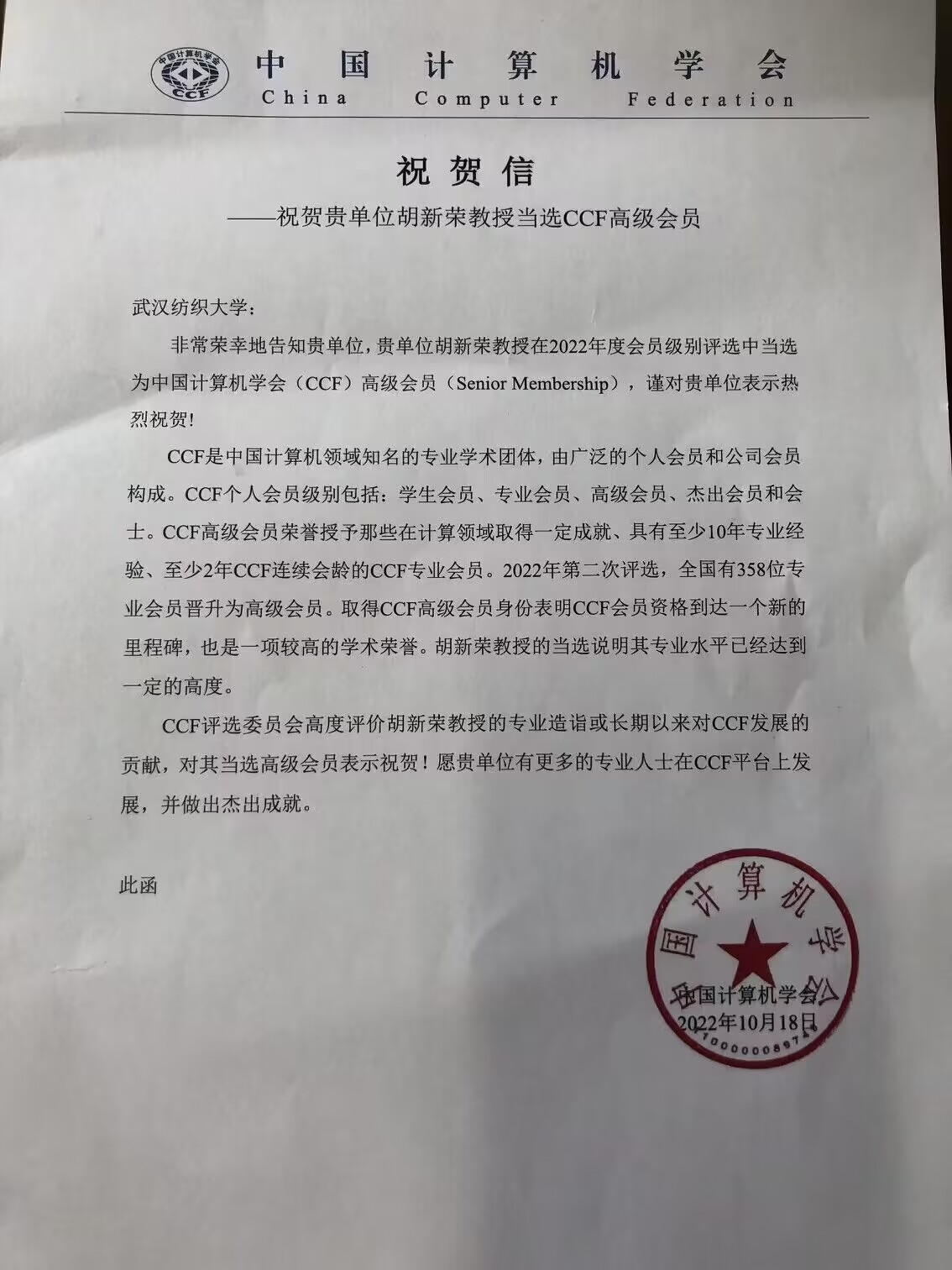 近日,中国计算机学会(CCF)向欧美伦理电影 发来祝贺信,祝贺欧美伦理电影 胡新荣教授在2022年度会员级别评审中当选中国计算机学会(CCF)高级会员(Senior Membership)。