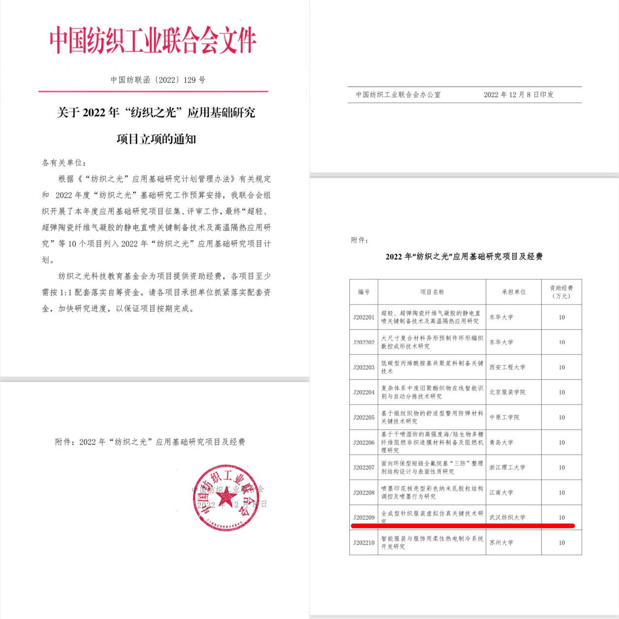 近日,中国纺织工业联合会公布了全国2022年度“纺织之光”应用基础研究立项项目名单,欧美伦理电影 胡新荣教授主持的“全成型针织服装虚拟仿真关键技术研究”获得资助(全校唯一)。