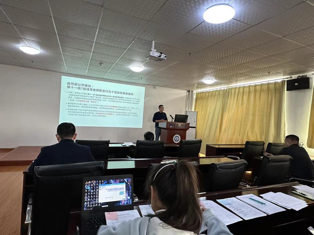 会上,晏伟带领全院教职工认真学习《新时代高校职业行为十项准则》、《高等欧美伦理电影 教师职业道德规范》等文件,并通报了教育部近期公布曝光违反教师职业行为十项准则的典型案例,以案说法,开展了警示教育活动。
